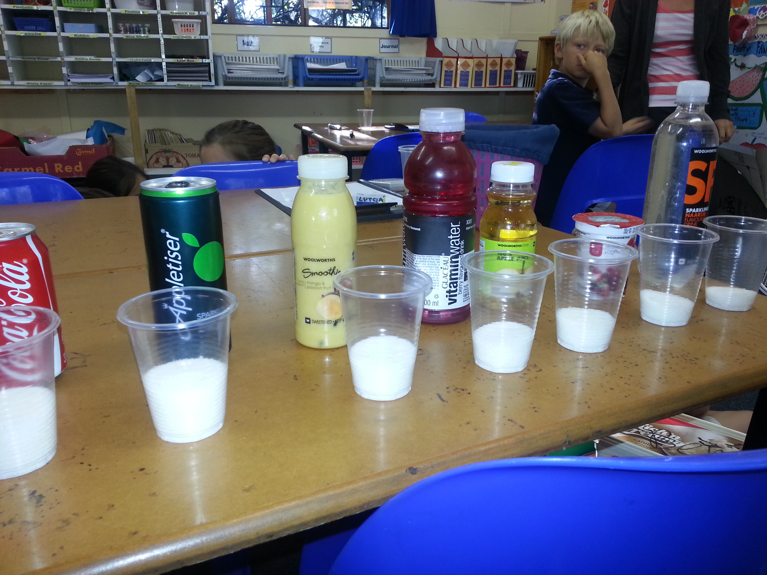 The photo on the right was taken during my talk with the kids ,where we spooned the amount of sugar for each item into a clear plastic cup. Little eyes went wide as saucers. That was exactly the reaction I was hoping for.